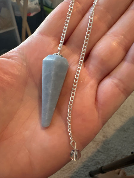Connect with peace, clarity, and higher guidance with this beautifully polished Angelite pendulum. Each piece features soft, soothing blue tones and a sleek faceted point, suspended from a silver-tone chain for effortless dowsing, energy work, or intuitive decision-making.