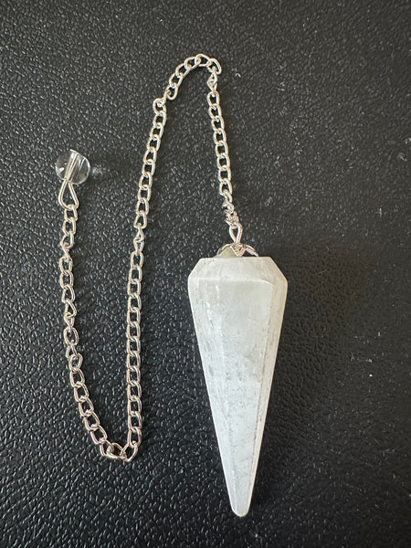 Connect with divine clarity, cleansing energy, and intuitive guidance with this genuine Selenite pendulum. Hand-carved into a sleek faceted point and suspended from a silver-tone chain, this pendulum is perfect for divination, energy work, chakra balancing, and spiritual decision-making.